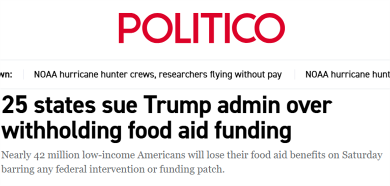 据美国《政治报》网站报道,受政府持续“停摆”影响,美农业部宣布暂停其“补充营养援助计划”(SNAP),11月1日起停止发放食品救济。目前这一项目覆盖约4200万人,约占美国总人口八分之一,其中多数为低收入群体和残障人士。SNAP项目暂停后,他们的生活将难以为继。当地时间28日,民主党主政的25个州和首都华盛顿对联邦政府提起诉讼,要求动用联邦应急资金,以维持这一项目。