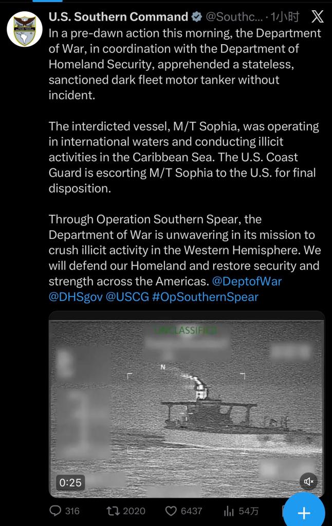 美国欧洲司令部当天在社交媒体上说:“美国司法部和国土安全部在与战争部的协调下,当天宣布扣押了‘贝拉1’号油轮,理由是其违反美国制裁。该船被美国海岸警卫队‘芒罗’号追踪后,在北大西洋海域被扣押,依据是联邦法院签发的逮捕令。”
