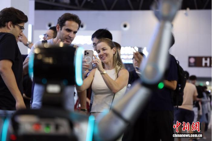 2025年7月,在上海举办的2025世界人工智能大会上,一款中国制造的机器人吸引外国观众。 中新社记者 汤彦俊 摄