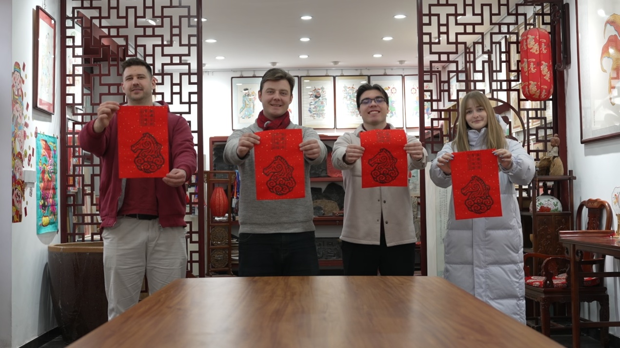 帝汉尼:我带他们感受中国传统文化,有剪纸,我们一起剪了一个“春”字。我还带他们去拓年画,先刷上墨,再把纸放上面,用木板刷刷刷,他们觉得很有意思。我们印了一个马。我们还一起包饺子,我像个老师一样教他们包饺子。其实我包得不好看,他们包得也不好看,主要是我们包饺子这个过程特别开心。