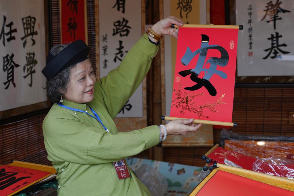 2月12日,在越南首都河内的新春书法节现场,一名书法家展示汉字书法作品。新华社记者 刘颍 摄