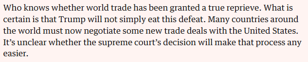 文章认为,全球贸易是否迎来真正喘息尚未可知。但可以肯定的是,美国政府绝不会就此“善罢甘休”。世界各国如今不得不与美国重新商定贸易协议,而最高法院的裁决能否让这一进程变得顺利些,目前仍是未知数。