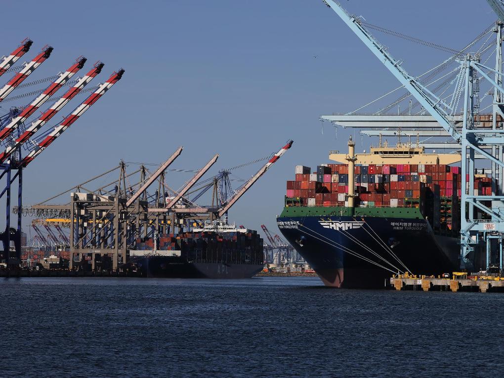 这是2025年5月10日在美国洛杉矶港拍摄的货船。新华社发(邱晨摄)
