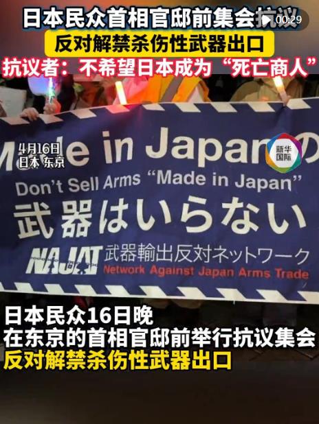 针对高市早苗政府计划近期修改“防卫装备转移三原则”及其运用指南,日本民众16日晚在东京的首相官邸前举行抗议集会,反对解禁杀伤性武器出口。