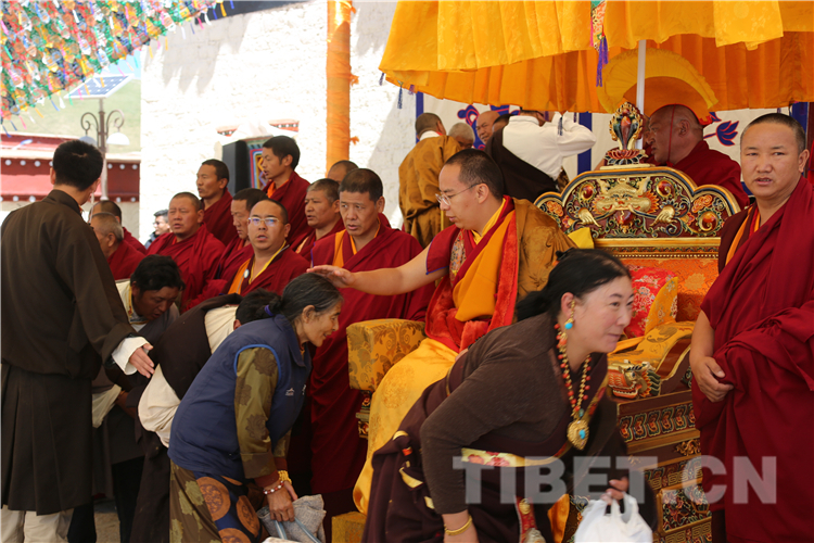 那曲市孝登寺由活佛洛桑尊珠•丹白嘉措始建,距今已近200年历史。8月9日,十一世班禅前往孝登寺礼佛朝拜,抵达孝登寺后,珠康•土登克珠活佛向十一世班禅敬献哈达。随后,十一世班禅登上宝座带领僧众集体诵经祈福,为寺庙僧众和早早在此等候的信教群众举行长寿灌顶、摸顶赐福,为僧俗信众发放长寿金刚结、长寿丸等。