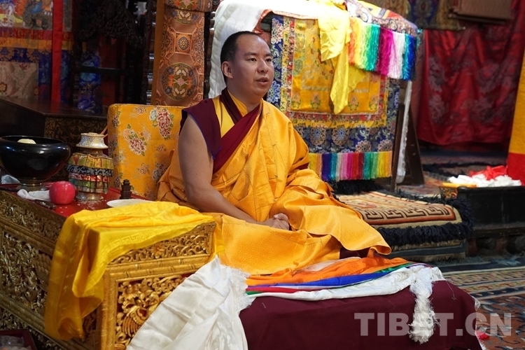 当天清晨,扎什伦布寺桑烟缭绕、法号声声,28 位受戒的年轻僧人带着新制袈裟,迎着朝霞依次走向拉让殿等待班禅授戒这一神圣时刻的到来。8时许,在手持黄伞、香炉和吹唢呐的高僧护送引领下班禅缓缓步入拉让殿,并与在场僧众集体诵经。诵经仪式结束后,班禅就坐于拉让殿宝座,4名高僧大德作为授戒众,开始为僧人闭门授戒、剃度、赐法名、摸顶。此时,受戒僧人一一入座,两手在胸前交叉,听班禅引证经典告诫,并宣誓严守戒律。
