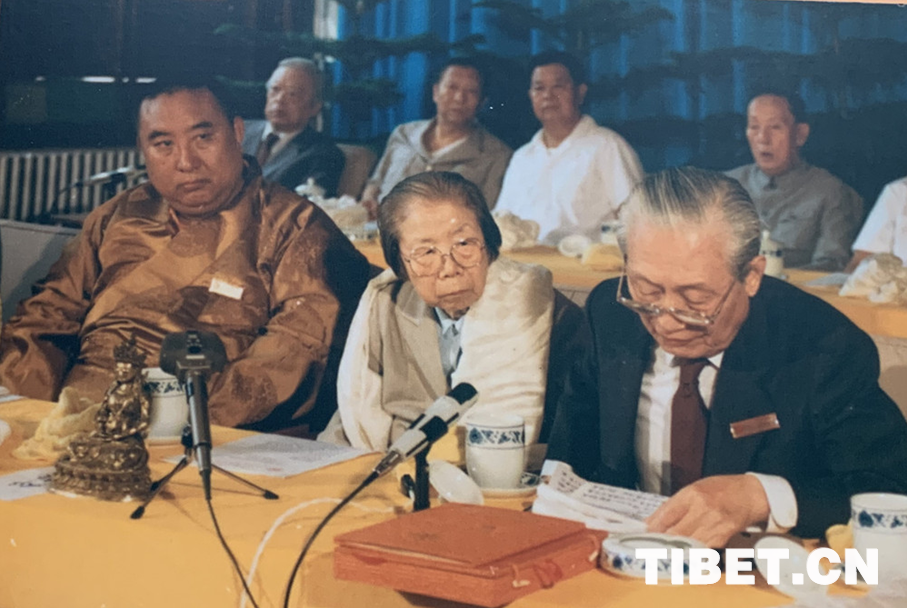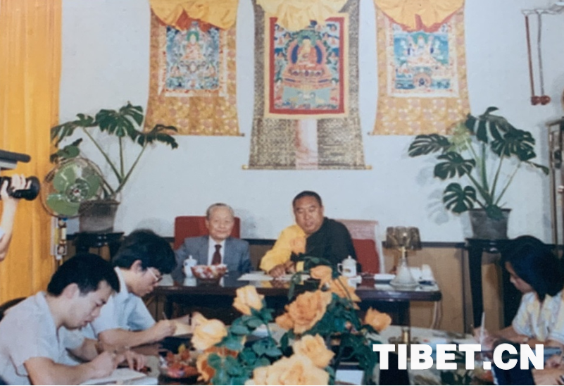 图为1987年,十世班禅和赵朴初在中国藏语系高级佛学院成立仪式新闻发布会上接受媒体采访。