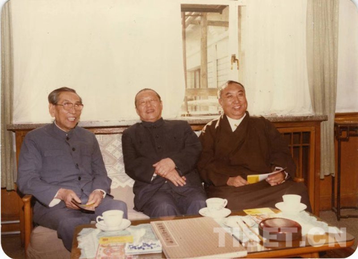 图为1987年初,十世班禅大师与习仲勋、阿沛•阿旺晋美商议援助西藏发展基金会筹备事宜。