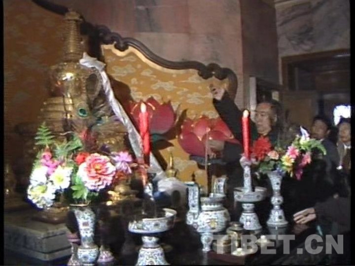 图为1987年4月,十世班禅大师和阿沛•阿旺晋美率领援助西藏发展基金会筹备委员会委员朝拜灵光寺佛牙舍利塔,并亲自敬献哈达。