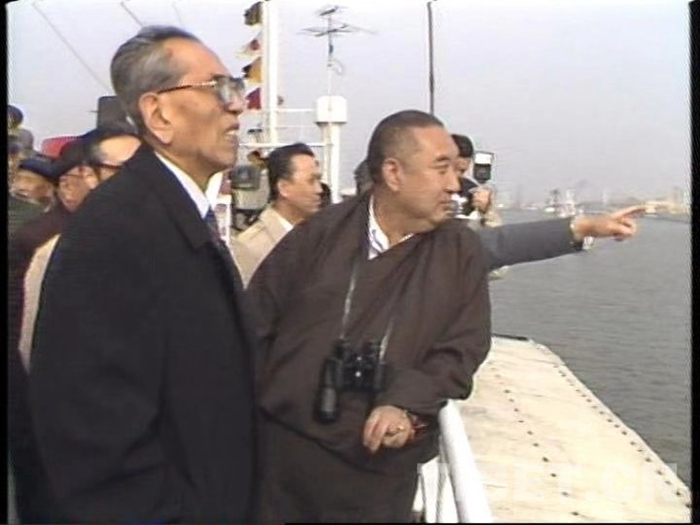 图为1987年4月19日,十世班禅大师和阿沛•阿旺晋美率领援助西藏发展基金会筹备委员会委员考察天津港。