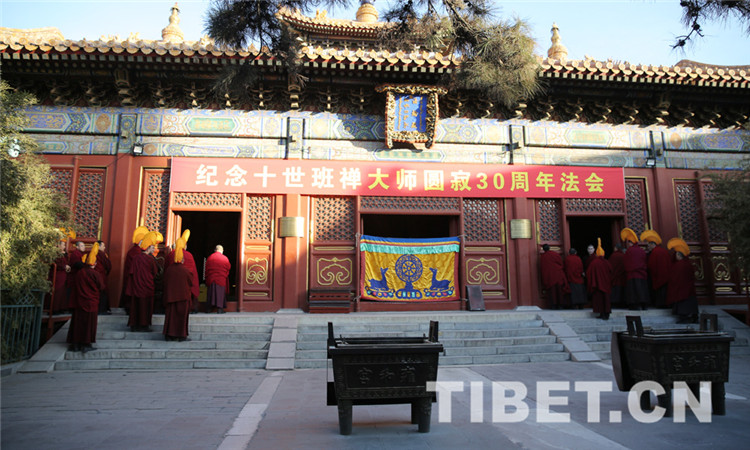 中国西藏网讯 1月28日,雍和宫举行法会,纪念十世班禅大师圆寂30周年。图为上午8时许,约80位教职人员、僧人诵祷经文,有序进入法轮殿。
