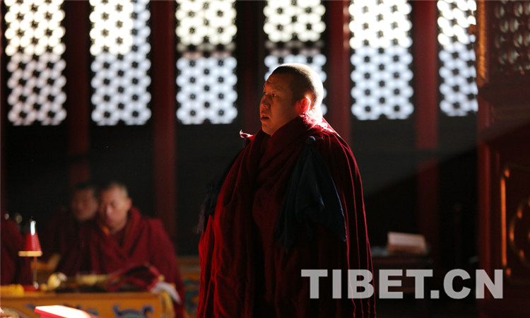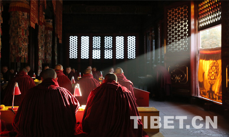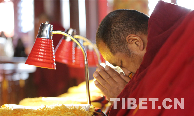 8时30分,法会开始,教职人员按既定仪轨,诵读经文,虔诚祈祷,法会现场肃穆庄重。(中国西藏网 记者/杨月云)