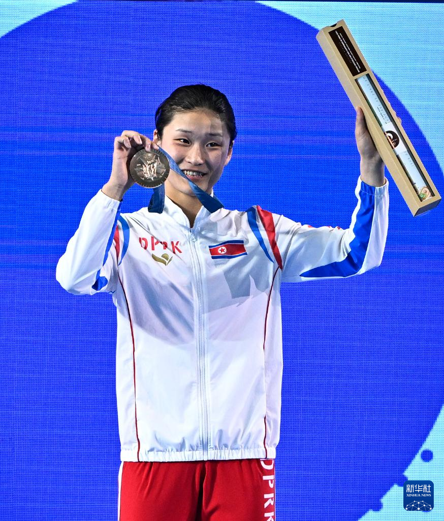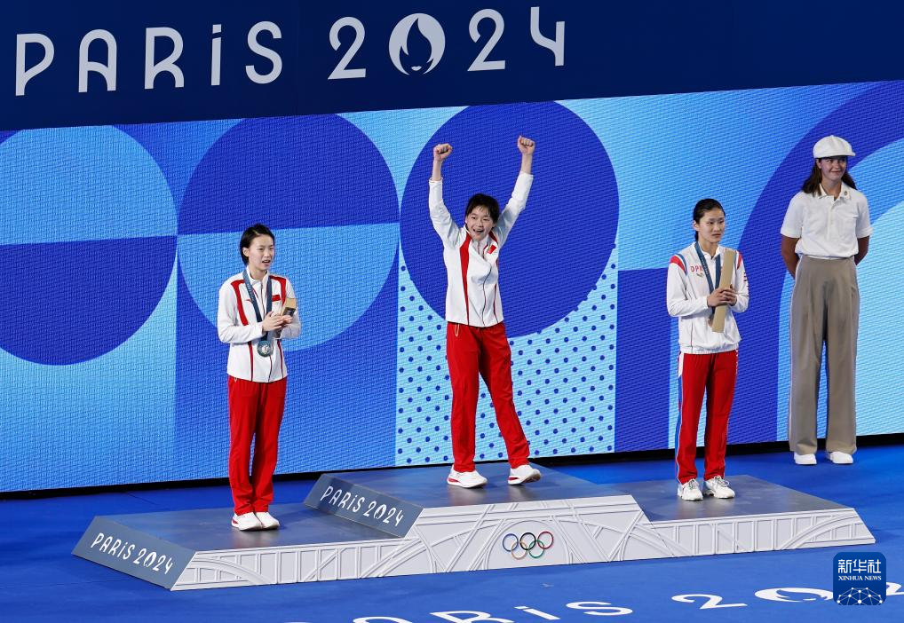 8月6日,冠军中国选手全红婵(前中)、亚军中国选手陈芋汐(前左)、季军朝鲜选手金姬燕(前右)在颁奖仪式上。新华社记者 张玉薇 摄