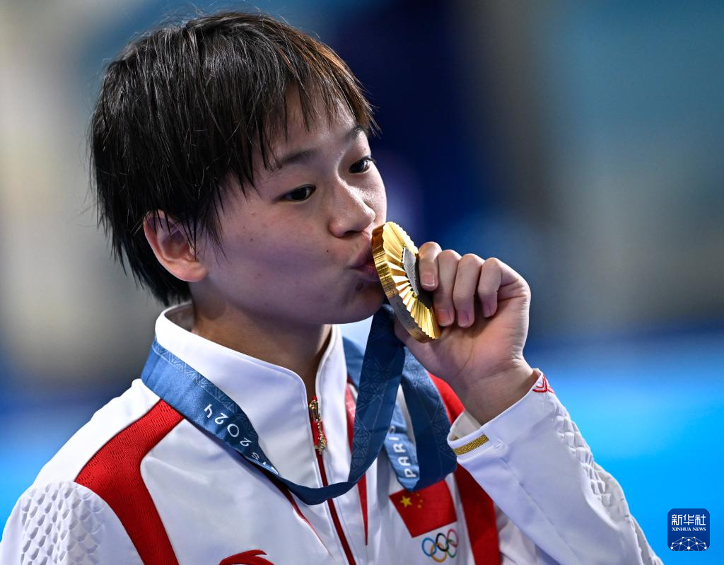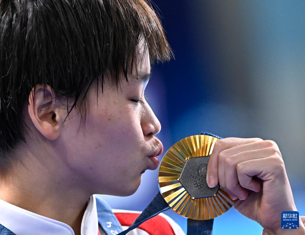 8月6日,全红婵亲吻金牌。新华社记者 王鹏 摄