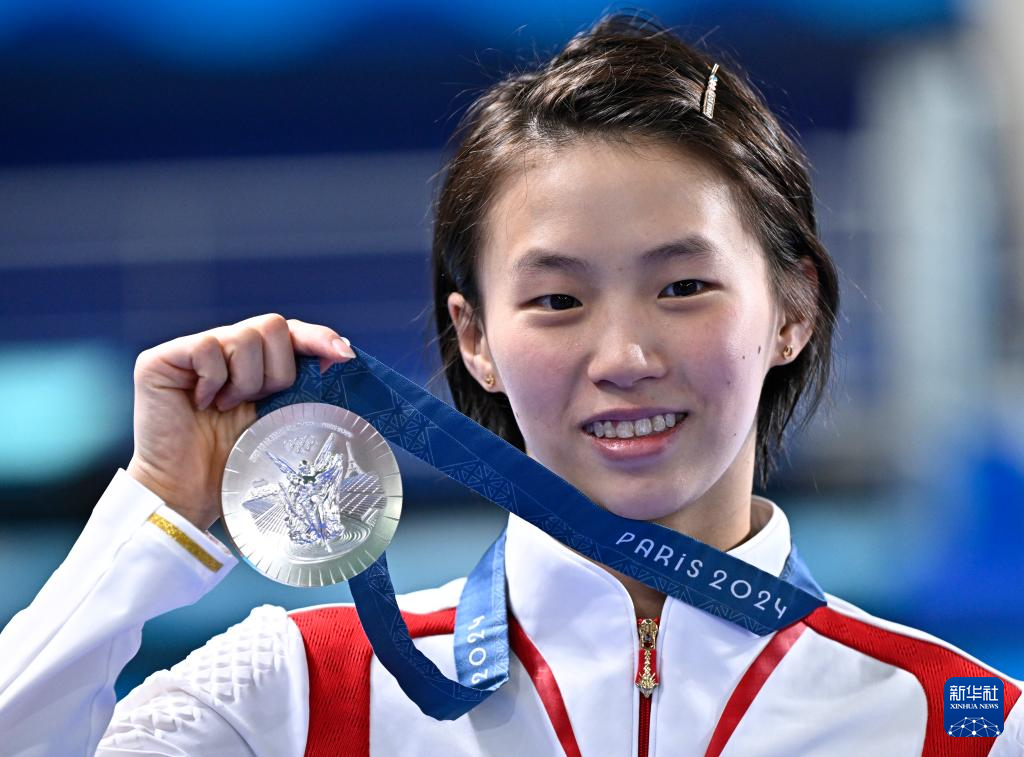 8月6日,陈芋汐展示银牌。新华社记者 王鹏 摄