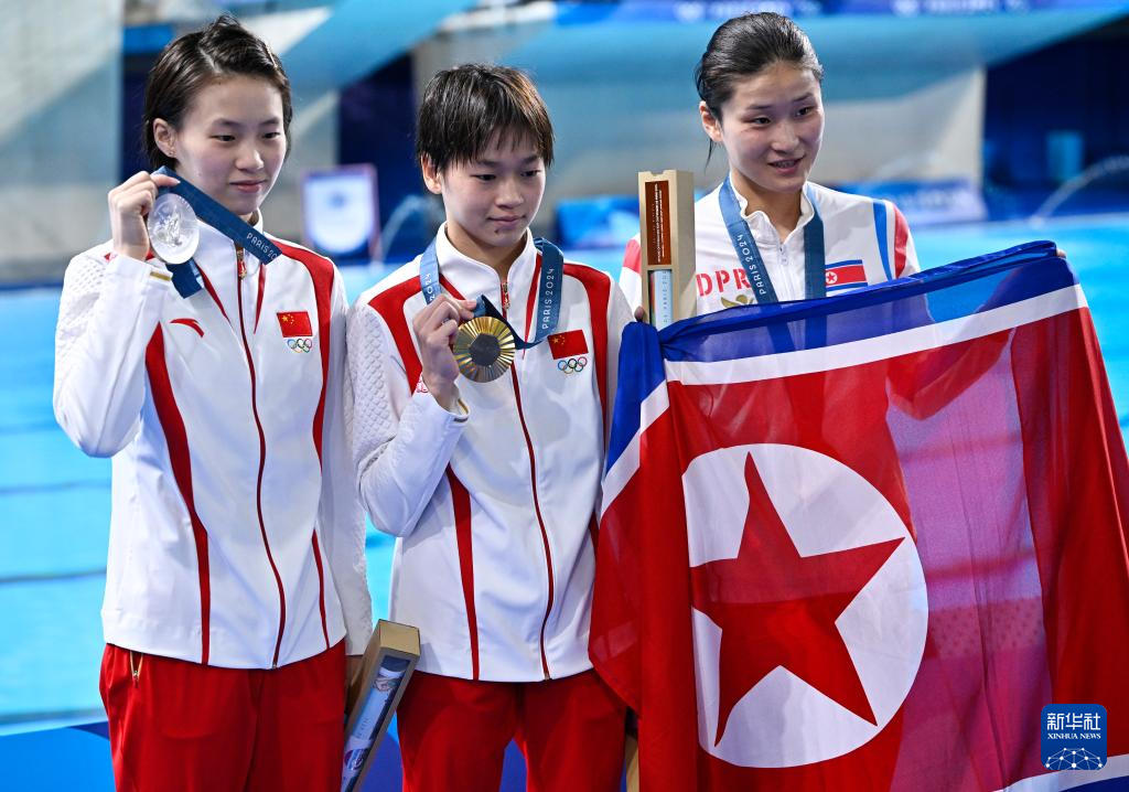 8月6日,冠军中国选手全红婵(中)、亚军中国选手陈芋汐(左)、季军朝鲜选手金姬燕在颁奖仪式后合影。新华社记者 王鹏 摄