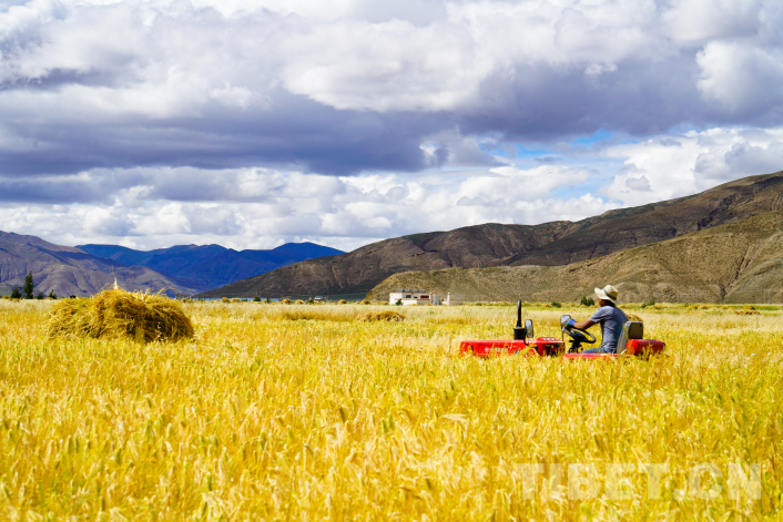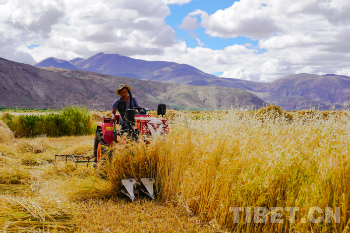 飘香的秋日一片金黄,一台台收割机正在青稞田里往来穿梭。2023年,西藏青稞产量达84.36万吨,播种面积达222.87万亩,累计建成高标准农田430万亩,青稞良种覆盖率达到93%,主要粮食作物耕种收综合机械化率达到71%以上。