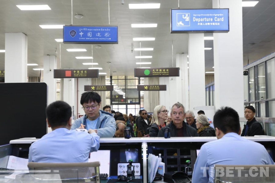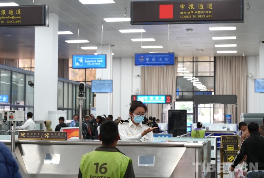 另一边,在吉隆口岸出境大厅内,吉隆出入境边防检查站执勤二队副队长曹刚正带领着队员为过境旅客办理手续。关卡设置快捷便利,信息化的通关服务极大地提高了通关效率。来自福建的陈女士便是其中一位受惠者,“很多(尼泊尔的)边民是因为购物出入境的,他们看我们是中国游客,就让我们先过检,通关挺顺利的,也很快。”