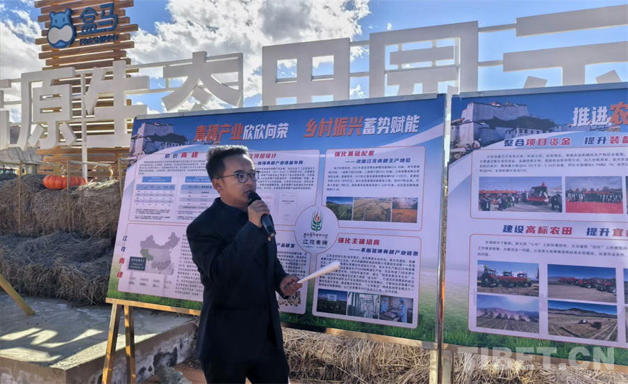 图为江孜县负责人介绍青稞产业情况 摄影:陈卓然