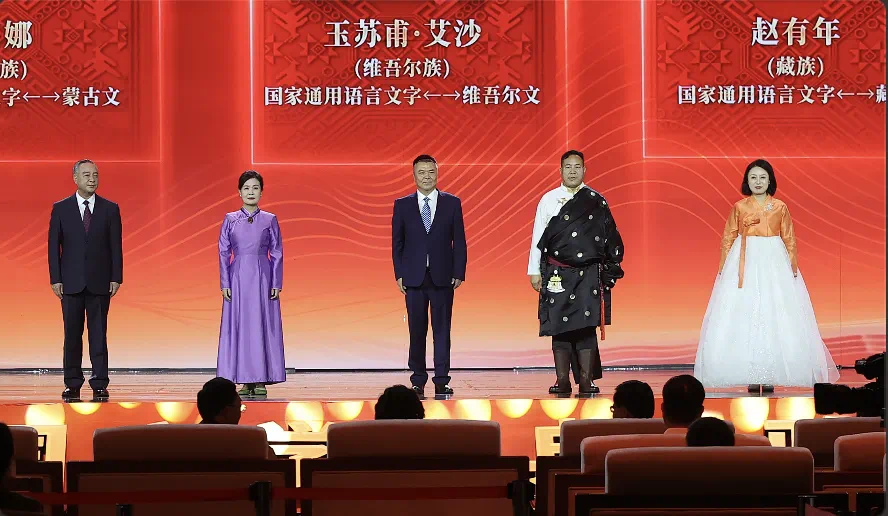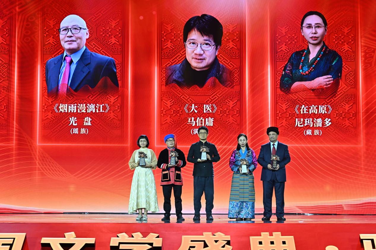 盛典现场,各民族获奖作家先后登台领奖,成为当晚最耀眼的主角。30位获奖者身着民族盛装,在《我的祖国》的悠扬乐声中接过奖杯,与观众和读者分享自己的创作经历和人生故事。