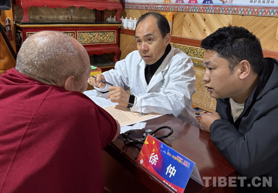 图为医疗专家们在草登寺义诊,广州医科大学附属第三医院老年医学科主任、主任医师徐仲正在与草登寺僧人沟通病情 摄影:喇应强