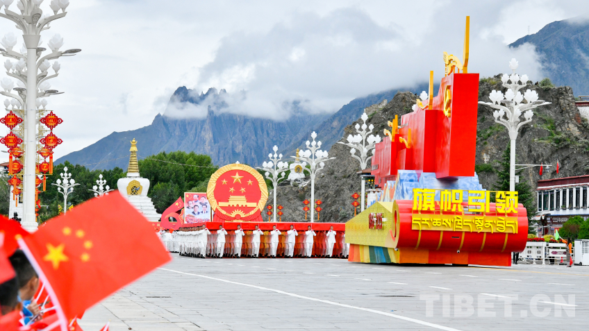 “旗帜引领”彩车,车头矗立巨型党旗,八面五星红旗有序排列其后,展现了在党中央坚强领导下,西藏各族儿女同心同向、团结奋进的时代图景。