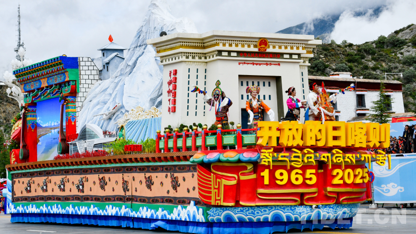 日喀则市彩车,彩车头部为吉隆口岸造型,象征着日喀则作为面向南亚开放中心城市的特殊战略地位。国门前,两名着定日服饰的地震灾区群众代表,手捧切玛,表达对以习近平同志为核心的党中央的深深感恩之情。