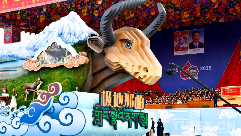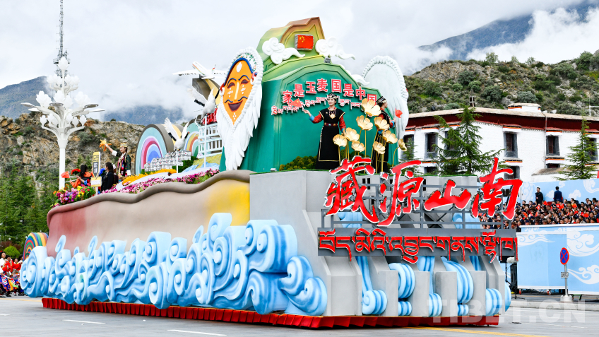 山南市彩车,以传统的牛皮筏为造型主体,融合雅鲁藏布江水系,总体造型为“前进中的方舟”,激荡着山南厚重的历史与活力。