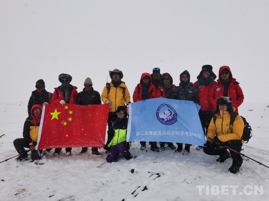 图为中国科学院古脊椎动物与古人类研究所和西双版纳热带植物园科考人员在希夏邦马峰海拔6000米化石地点的暴雪中 受访者供图