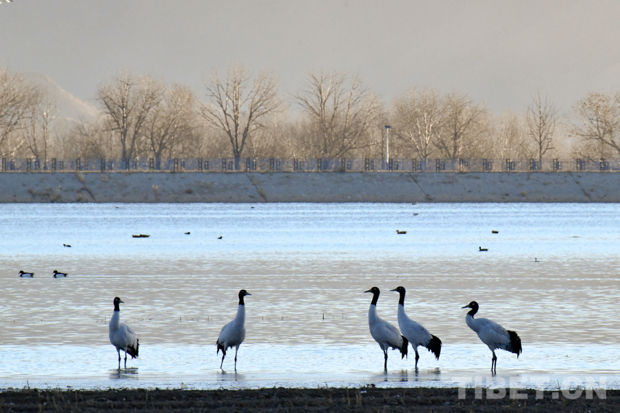 图为拉萨市林周县卡孜水库内越冬的黑颈鹤(摄于11月23日)摄影:赵振宇