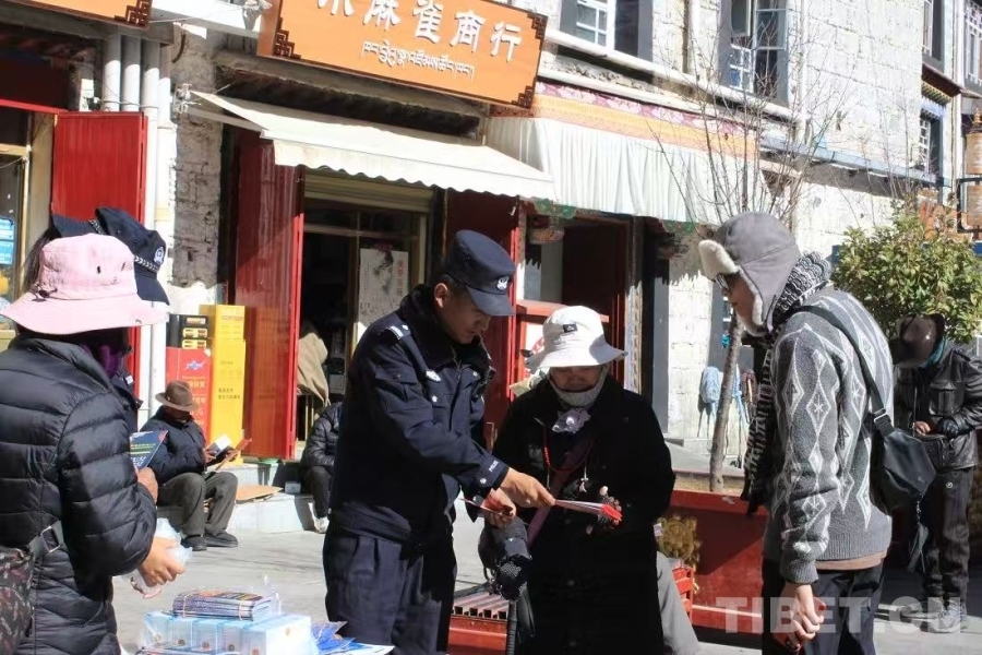 图为拉萨市公安局民警在拉萨街头进行法治宣讲(拉萨市公安局供图)