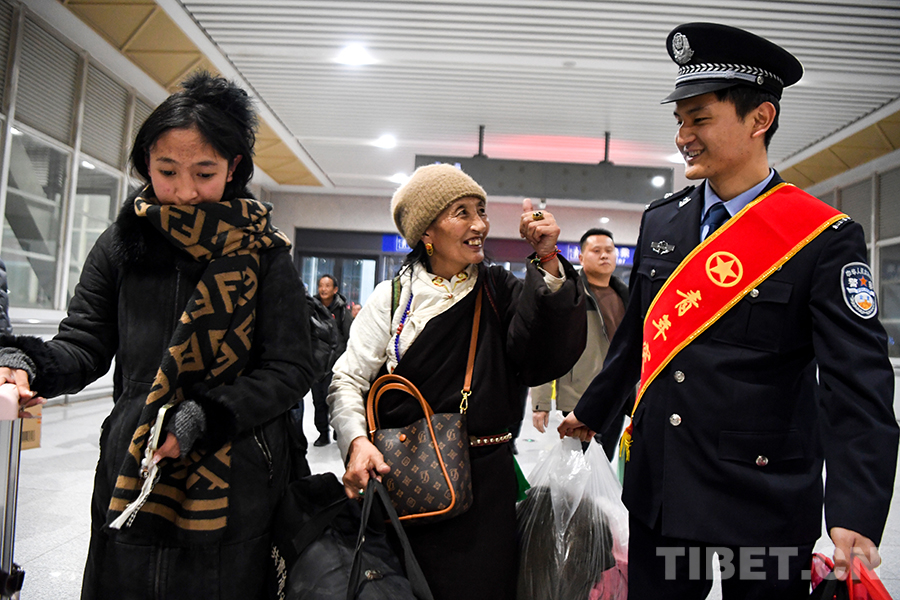 图为身着藏蓝、肩披红绶带的格尔木铁路公安民警帮助返乡的藏族阿妈踏上春运旅途