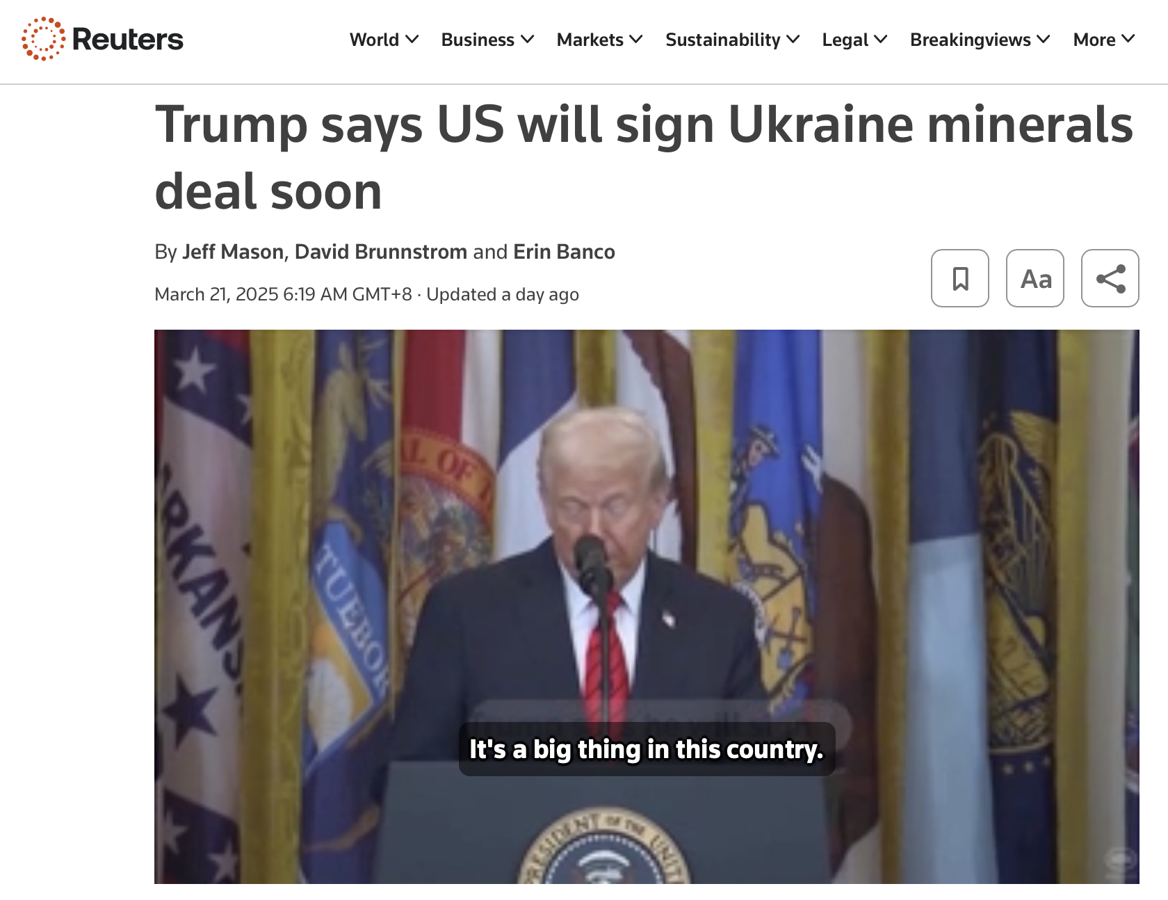 “我刚刚签署了一项行政命令,以大幅提升关键矿物和稀土的产量,这是一件大事。如你们所知,我们还在各个地方签署协议以发掘世界各地的稀土和矿物以及其他许多东西,特别是在乌克兰。”