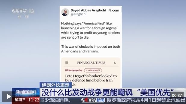 对于美国国防部长赫格塞思的投资经纪人曾在美以对伊朗发起军事打击前,尝试投资防务类基金一事,伊朗外交部长阿拉格齐3月31日在社交媒体发文说,没有什么比为一个外国政权发动战争、并从被派往前线的年轻士兵之死中牟取暴利,更能嘲讽“美国优先”口号的了。