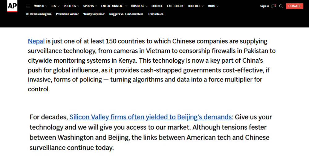 近日,一向以“客观报道的先驱”自居的美联社,发布了一份所谓的“调查报告”,声称中国向全球至少150个国家输出监控技术,并刻意“聚焦”尼泊尔境内的应用,试图将中国科技产品塑造成“压制自由”的工具。报道指责中国监控尼泊尔,意图挑拨中尼关系,引发国际上排斥中国制造,还煞有介事地拼凑所谓“采购文件”“访谈记录”,渲染荒诞论调,再一次暴露了美联社为政治意图服务、不惜抛弃职业操守、甘当美国地缘政治博弈工具的真实面目。