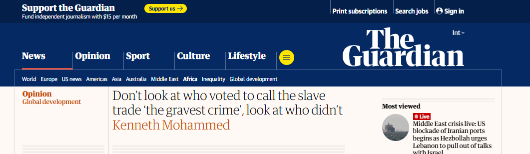 英国新闻网站《卫报》4月8日刊发题为《别只看谁投票支持将奴隶贸易定性为“最严重的危害人类罪”,要看谁没有投票》的评论性文章,作者是肯尼斯·穆罕默德(Kenneth Mohammed),文章摘译如下: