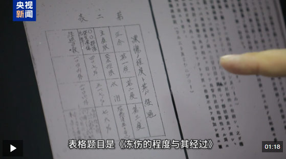 侵华日军第七三一部队罪证陈列馆研究人员 谭天:这就是论文里的一张表格。表格题目是《冻伤的程度与其经过》。第一度,发红肿胀,第二度,出现水疱,第三度,坏死,含溃疡。第三度,它这里头写五十到六十天,脚趾、手指脱落。无疑,这是经过大量人体实验,得到的所谓的数据。