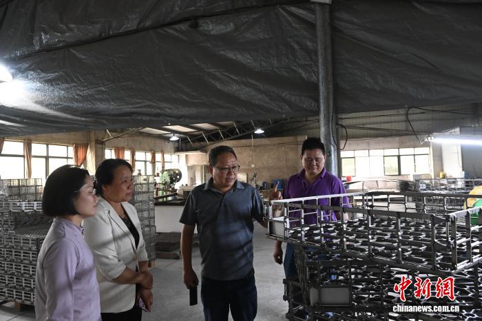 图为庄文祈(右二)和庄钛德(右一)向来客介绍工厂生产情况。中新网记者 蒋雪林 摄