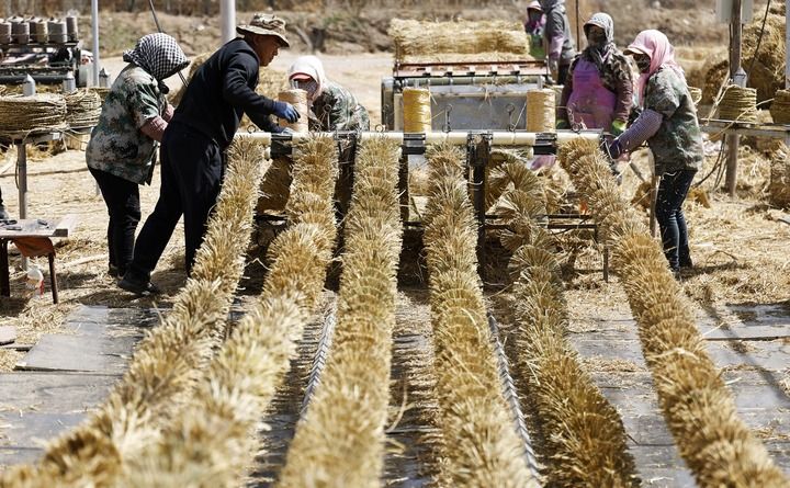 暮春时节,驱车行驶在宁夏中卫境内的腾格里沙漠东南缘,沙脊线上,治沙工人展开一捆捆刷状草绳纵横铺设,仿佛为沙丘披上“格子衫”。