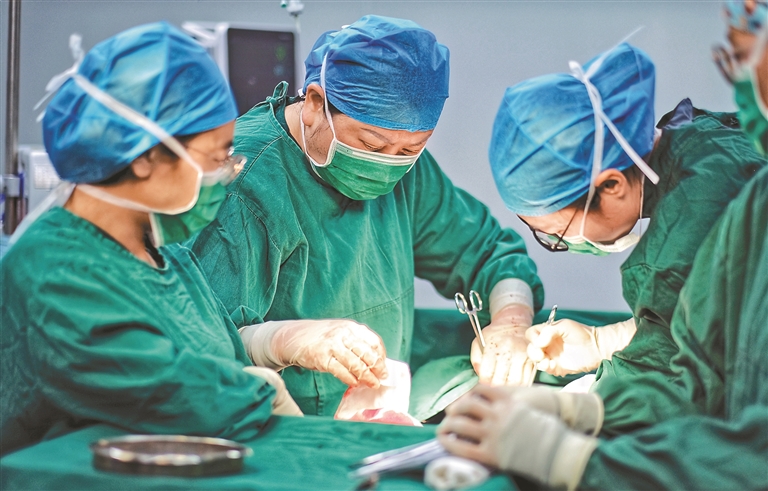 图为襄阳市第一人民医院妇产科主治医师为藏族妇女做剖腹产手术。白玛泽旺 本报通讯员 伦珠泽仁 曲杰 摄
