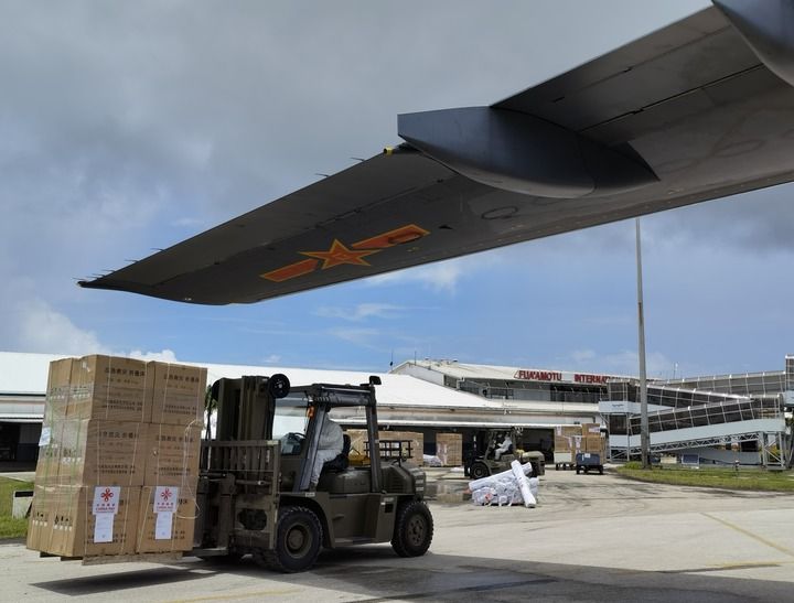 工作人员在汤加首都努库阿洛法机场卸载中国运-20飞机运送来的援助物资(2022年1月28日摄,手机照片)。