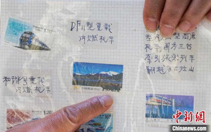图为徐超展示其收藏的中国邮政为纪念青藏铁路全线建成通车,于2006年7月1日发行的一套纪念邮票中的其中一枚名为《列车驶过唐古拉山》的邮票。 马铭言 摄