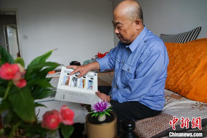 图为徐超翻看关于青藏铁路的纪念站台票册。 马铭言 摄