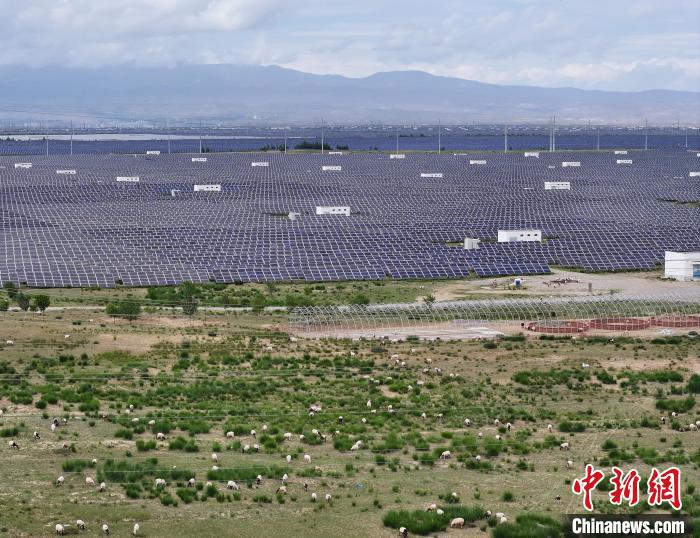 图为“光伏羊”在青海省共和县塔拉滩光伏产业园内觅食。(无人机照片)中新社记者 马铭言 摄