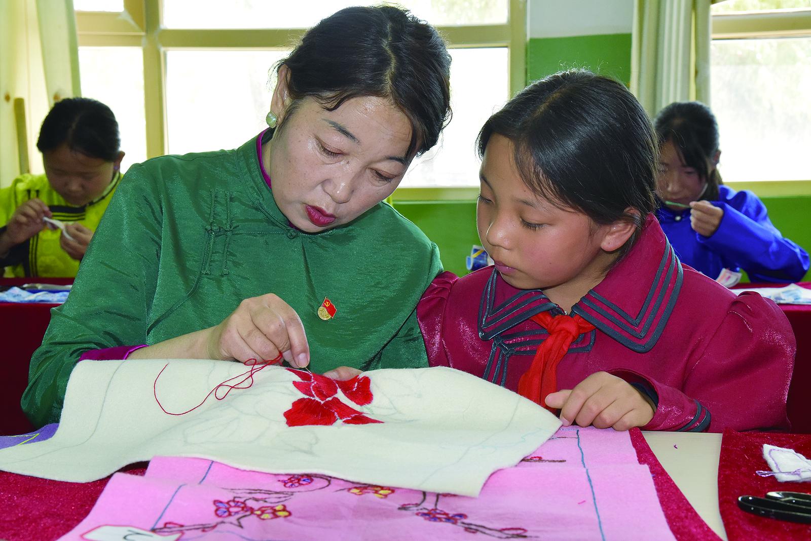教学生蒙古族刺绣。苏烽 摄