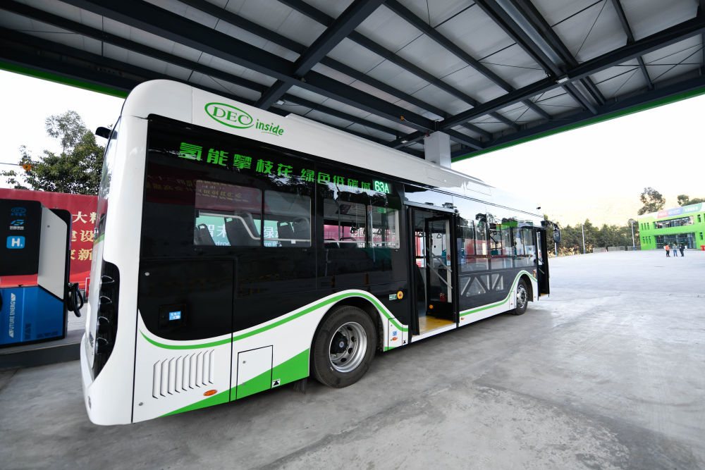 停靠在攀枝花加氢站的氢能公交车(2022年11月27日摄)。新华社记者 胥冰洁 摄