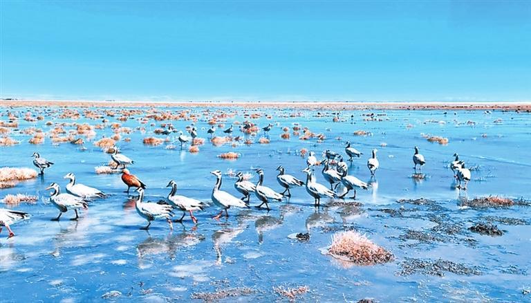 在这片湿地上,黄河的支流蜿蜒曲折,形成各式各样的曲线。阳光下,这些弯弯曲曲的大小沼泽,犹如一条条银色的丝带,闪闪发光。触手可及的蓝天白云无际无涯,像洗涤过似的,亮得耀眼,牛羊满山坡,宛如散落在人间的珍珠。这种原始的自然美景和丰富的生态资源,让阿万仓湿地成为一个理想的旅游目的地。