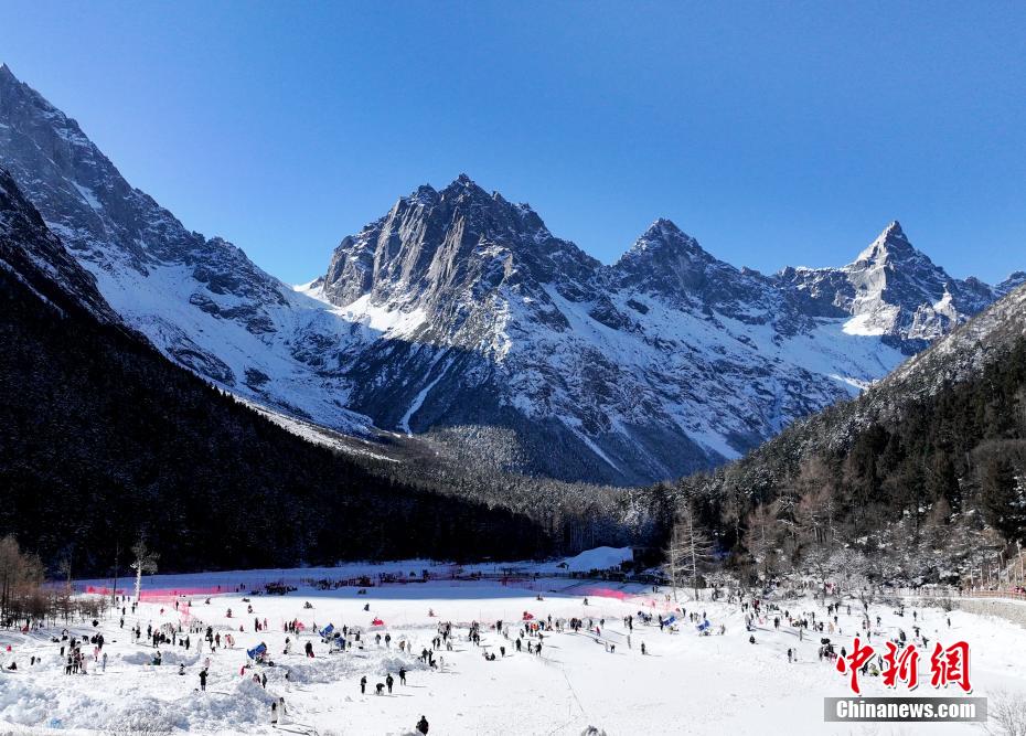 图为游客在毕棚沟冰雪世界游玩。(无人机照片)中新社记者 安源 摄