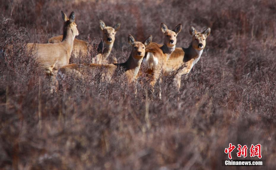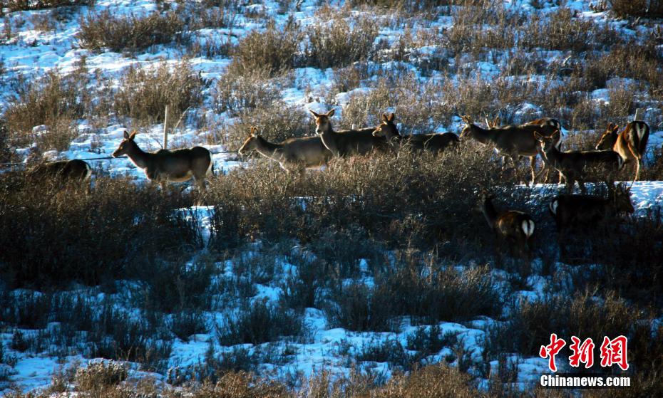 图为马鹿、狍鹿在覆雪的草原上成群出游。牛继荣 摄
