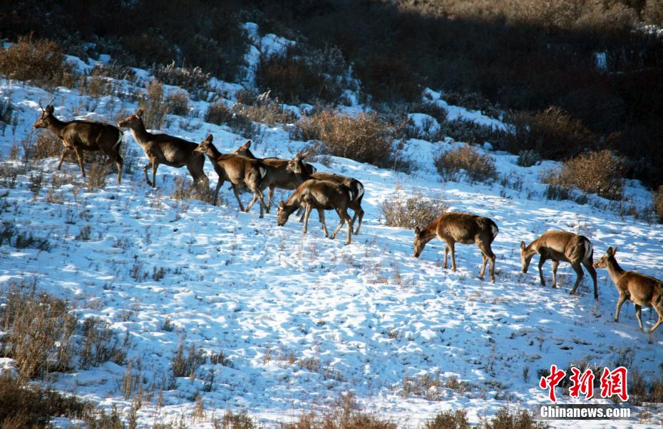 春日里,位于甘肃省武威市天祝藏族自治县境内马牙雪山脚下的抓喜秀龙草原,生机勃勃,国家二级保护动物马鹿、狍鹿时而奔跑,时而跳跃,成群结队“出游”,与覆雪的草地相映成趣,构成了一幅美丽的生态画卷。